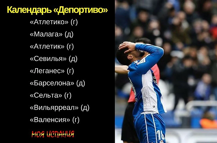 «Атлетико», «Барса», «Валенсия», «Севилья» вряд ли отдадут очки. «Атлетик», «Сельта», «Вильярреал» дарить тоже ничего не будут. «Леганес» запрётся на своей половине поля, и попробуй им забить. «Малаге» нужно бороться за свою честь. Вот и получается, что шансы «Депора», если судить по календарю, крайне ничтожны. Свой финал галисийцы уже проиграли на «Риасоре», когда скатали нулевую ничью с «Лас Пальмасом». Был шанс, с «Эйбаром», и там тоже очки отдали.