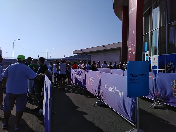 Возле сочинского билетного центра столпотворение. Очередь поделена несколько секций: для получения и покупки билетов. Мы оказались здесь, чтобы легально, в кассу, продать билет на матч Англия-Тунис. Я не решился идти туда, остался немного поодаль. Постепенно начали подходить русские и иностранцы. Все спрашивали про билеты на матч испанцев и португальцев