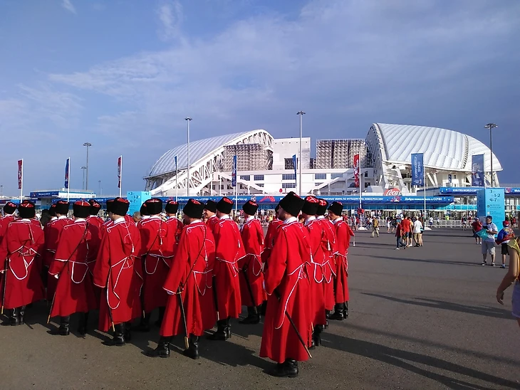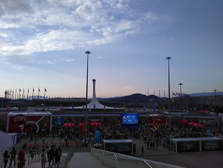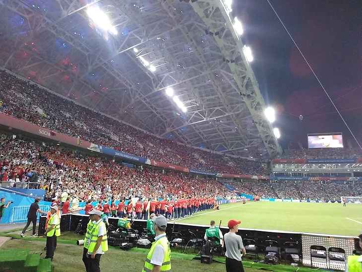 Часов за пять до матча у стадиона еще нет народа. Болельщики только-только едут из сочинской фан-зоны, а путь всё равно не близкий. Остается только пожалеть, что в Адлере, где и находится арена, нет как таковой зоны для фанатов. Различить в толпе русских, испанцев, португальцев трудно. Заговорить по-испански и в ответ получить вопрос «что?» - очень легко.
