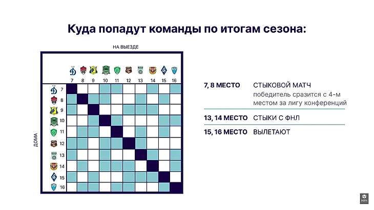 Нижняя десятка будет бороться за спасение от вылета. Здесь проведут один круг (9 матчей) – каждый по разу сыграет с каждым, а решать, с кем матчи будут дома, а с кем в гостях, будет жеребьевка. Тут все как и было: 15-16 места вылетают, 13-14 – играют стыки с клубами из ФНЛ.