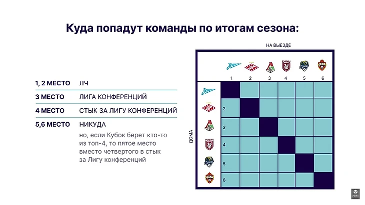 Шесть лучших команд весной будут биться за медали и еврокубки (2 команды – в Лигу Чемпионов, третья – в Лигу Конференций, 4 команда – стык за Лигу Конференций, 5 и 6 команда – никуда, но если Кубок России возьмет кто-то из топ-4, то пятое место вместо четвертого попадет в стык за ЛК). Эти 6 команд проведут 10 туров по системе “каждый с каждым дома и на выезде”.