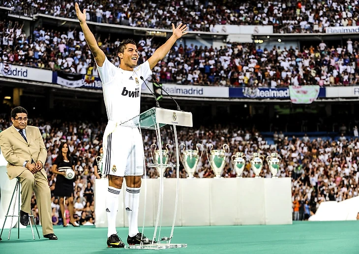 1) И номер один – презентация Криштиану Роналду в «Реале». Это был рекордный трансфер в мировом футболе на тот момент. На трибунах собралось 80 тысяч зрителей – этот рекорд посещения презентаций не побит до сих пор. Португалец перед выходом на поле явно нервничал, прижимался к стенке и глубоко вдыхал. В церемонии приняли участие легендарные ветераны Альфредо Ди Стефано и Эйсебио. Криш их очень душевно поприветствовал.