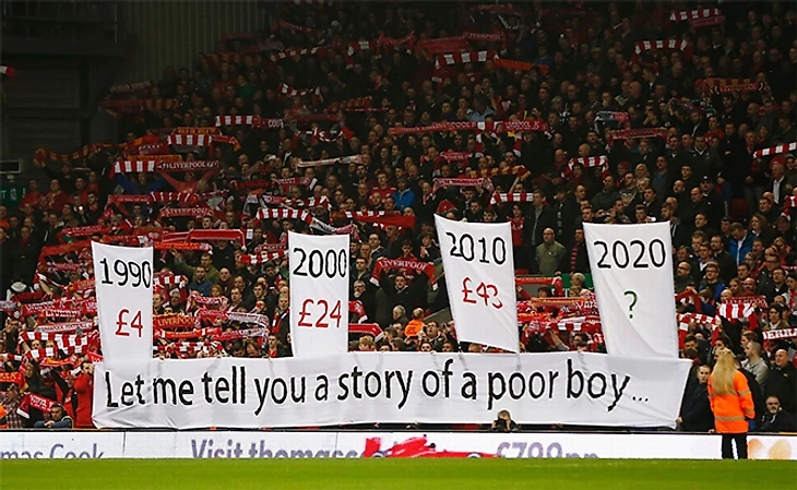 Несколько влиятельных групп болельщиков «Ливерпуля» (LFC Supporters’ Committee, ‘Spirit of Shankly’ и ‘Spion Kop 1906’, последняя отвечает за перфоманс на легендарной трибуне) начали бороться с грабительскими ценами на билеты, которые за время существования премьер-лиги выросли в десять раз. Они решили, что на «Копе» не будет флагов и баннеров в поддержку команды до тех пор, пока клуб не начнет диалог с болельщиками о ценах (исключение будет сделано только для игры с «Базелем» из-за ее особого значения). Как будет выглядеть «Коп» без традиционных растяжек было показано в субботу, и выбранный момент фанов не смущает – «сейчас очередь клуба поддержать нас».