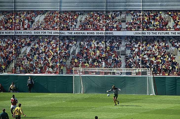 Летом 1992-го Северную трибуну легендарного «Хайбери» снесли, чтобы построить на ее месте новую. В том же году английский футбол начал меняться: стартовала Премьер-Лига, уже тогда это значило много денег, много телевидения и много камер. Чтобы эстетично прикрыть уродливые строительные леса и технику, в клубе выкрутились благодаря ноу-хау: вице-президент «Арсенала» Дэвид Дейн выделил 150 тысяч фунтов на изготовление огромного мурала с изображением восьми тысяч болельщиков, сидящих на нарисованных скамейках.