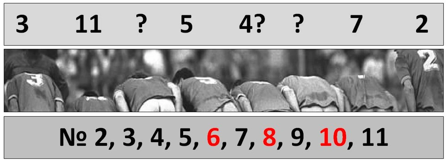 Номера на футболках третьего и шестого парней слева разобрать нереально. Но мы вполне можем пойти от противного – как при доказательстве теорем в седьмом классе средней школы.