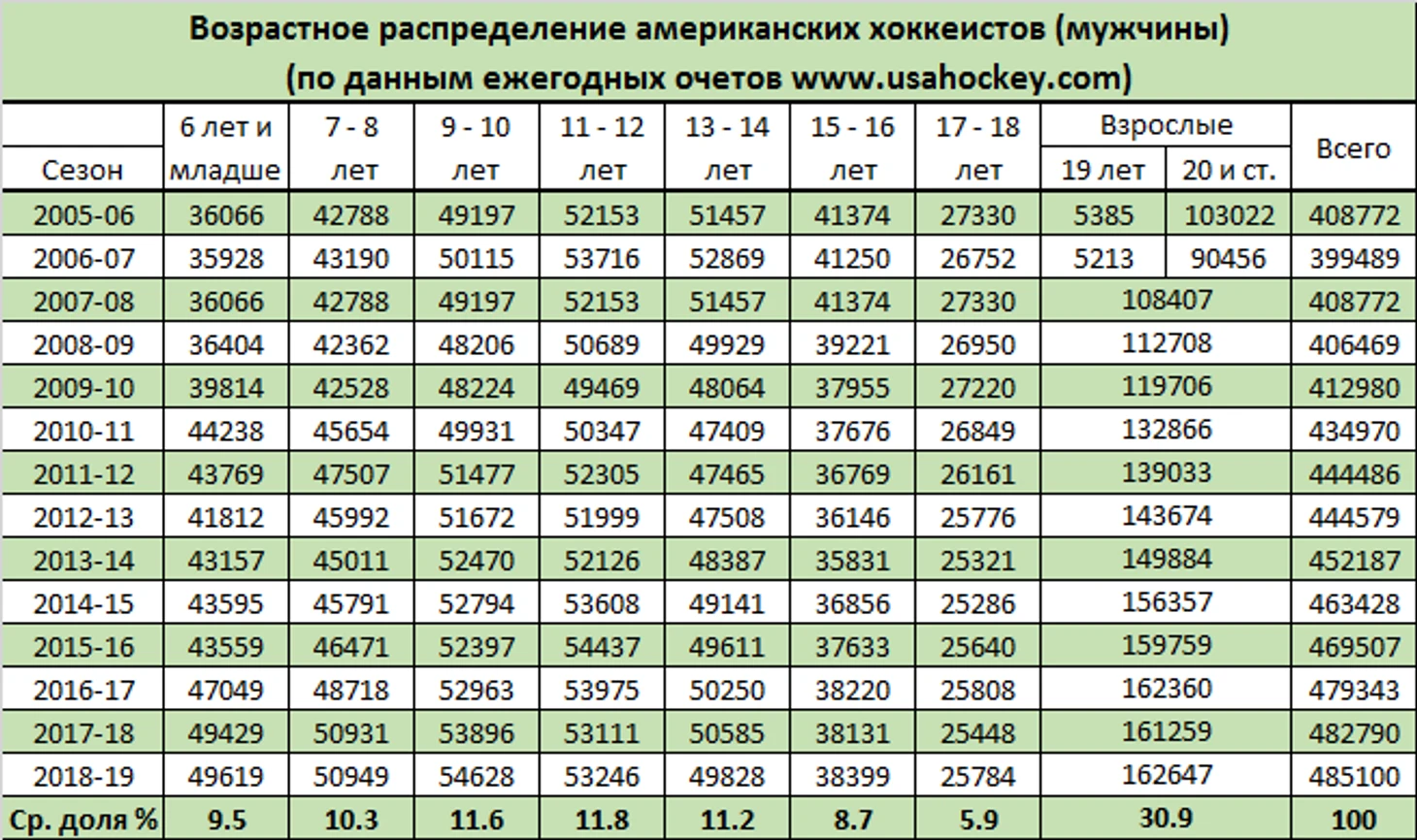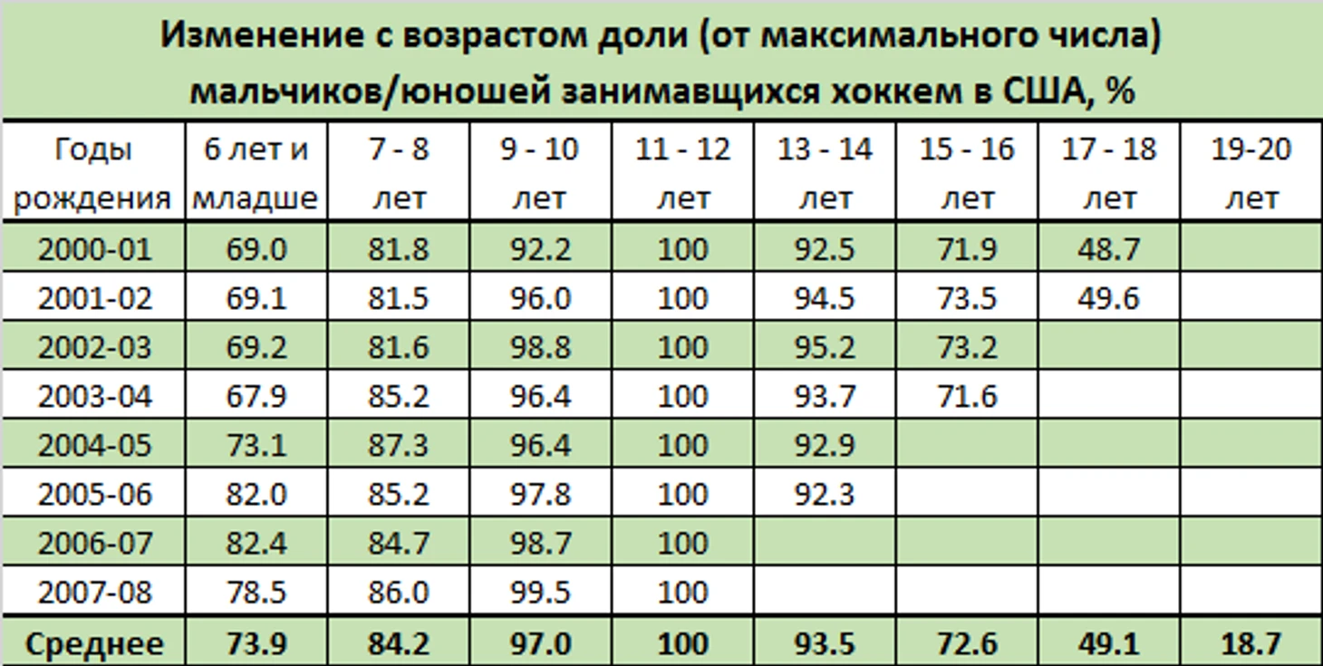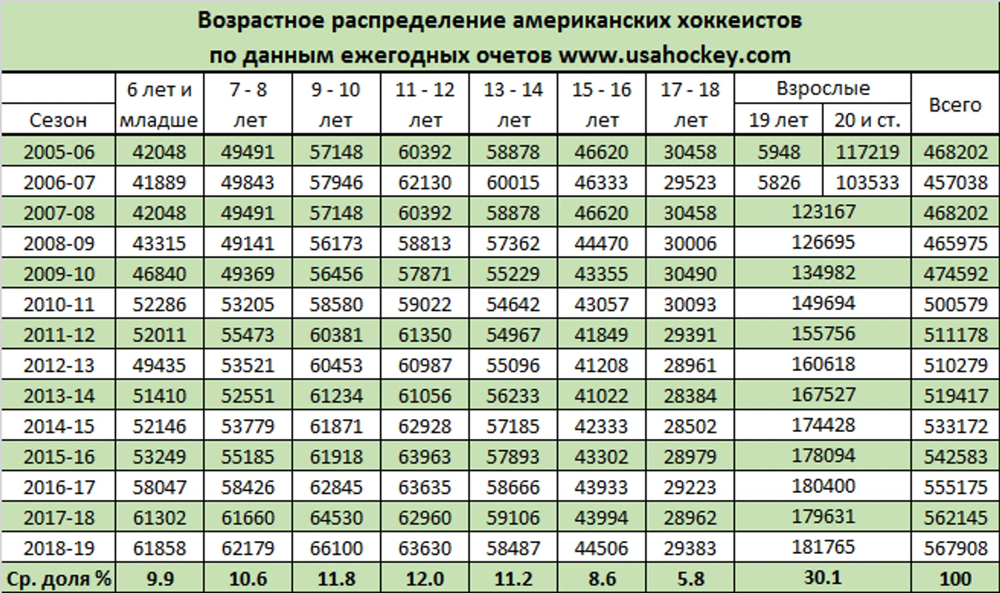 Статистика по 19 летним приведена только в двух самых ранних отчетах за сезоны 2005-2006 и 2006-2007. Если в 2006 году 17-18 летних игроков было 27330, то в сезоне 2007 игроков возраста 19 лет осталось лишь 5213. Можно грубо подсчитать, что во взрослый хоккей переходят около 19% от занимавшихся в детстве.