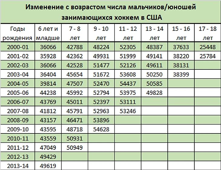 Например, по итогам сезона 2005-2006 было учтено 36066 хоккеистов возраста 5-6 лет т.е. 2000-2001 года рождения соответственно, после сезона 2007-2008 эти мальчишкам стало по 7-8 лет и общее число игроков 2000-2001 годов рождения составило 42788, максимальное число занимающихся для этих годов рождения было в возрасте 11-12 лет в сезоне 2011-2012 и составило 52305 игроков, далее со взрослением идет уменьшение занимающихся и к возрасту 17-18 лет остается лишь 25448 юниоров в сезоне 2017-2018.