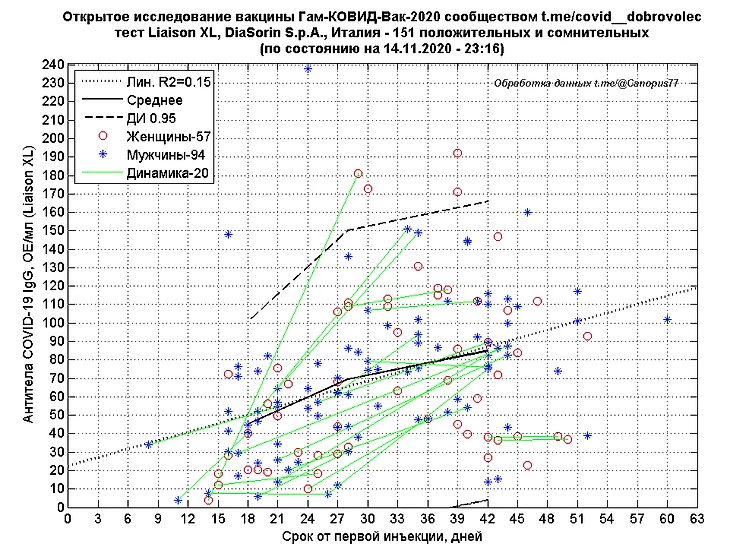 На рисунке результаты тестов сданных мужчинами обозначены звездочками, женщин кружками, они получили 94 и 57 результатов соответственно. 20 участников сдали тесты более одного раза, личная динамика уровня антител IgG от времени изображена зелеными линиями.