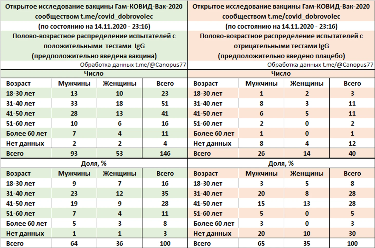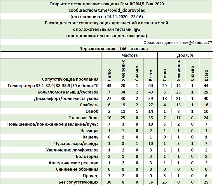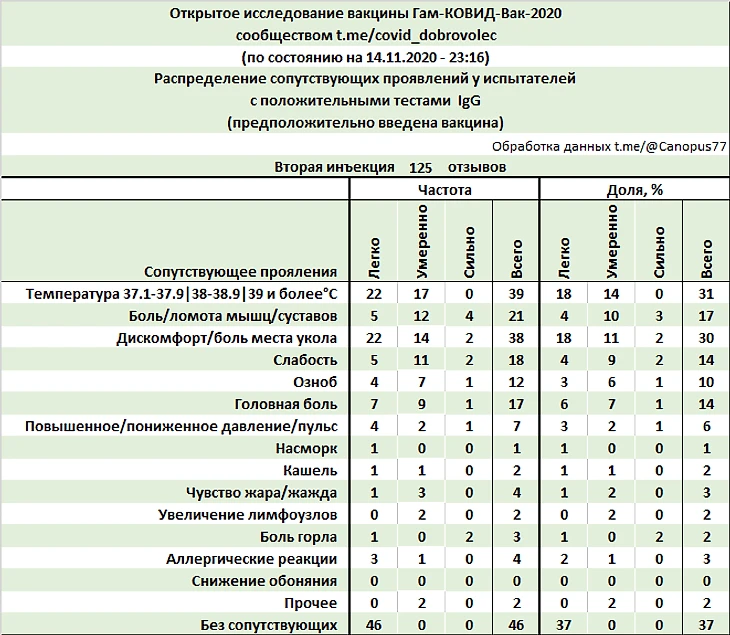 На момент 14 ноября 2020 года свои отзывы о вакцинации и результаты анализов оставили 192 добровольца-испытателя, это уже в несколько раз больше числа участников предшествующей фазы КИ.