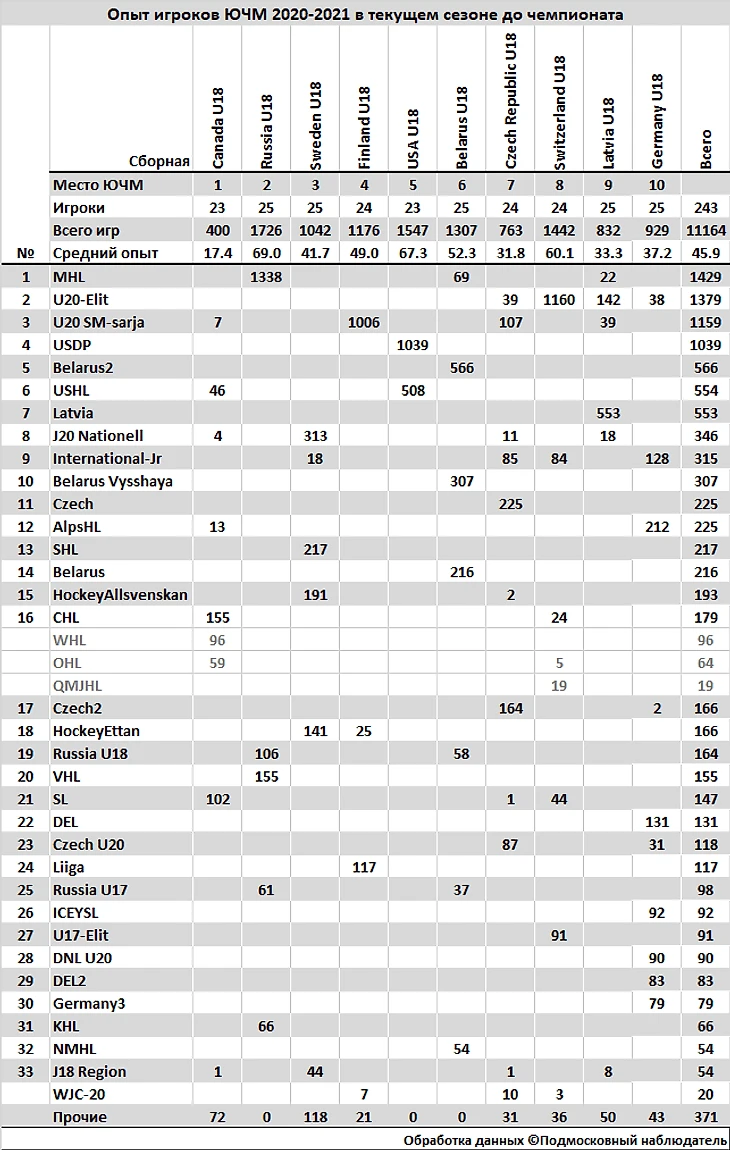 Наибольший суммарный опыт к ЮЧМ набрали игроки сборной России. Сумма их игр составляла 1726 матчей, из которых 1338 они провели в МХЛ, 155 в ВХЛ, 66 в КХЛ, 106 игр в российских турнирах U18, 61 в российских турнирах U17. Вторыми по опыту в сезоне были американцы, на их счету 1547 матчей, включая 1039 в рамках подготовки Юниорской сборной США - USDP (USA Hockey National Team Development Program) и 508 в USHL. Канадцы успели наиграть лишь 400 игр, 155 из которых в родной CHL, 102 во второй швейцарской лиге SL, 46 в американской USHL.