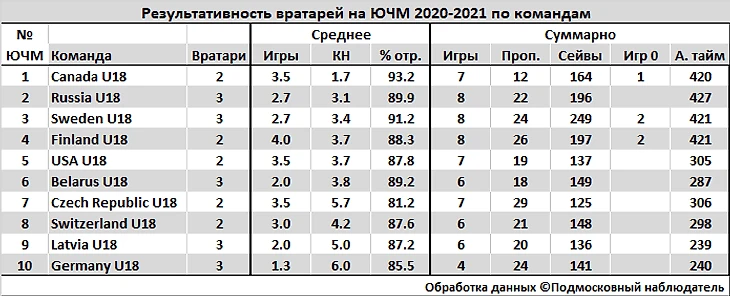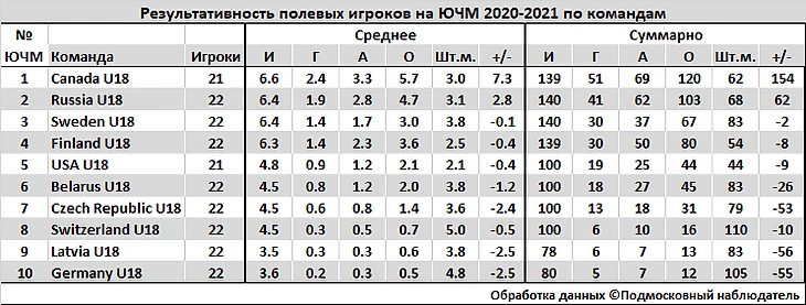 Если рассмотреть составы команд относительно представительства лиг, то российскую сборную представляли 22 игрока МХЛ и три юниора уже закрепившихся во взрослой ВХЛ, это Никита Чибриков, Федор Свечков и Дмитрий Кателевский. У чемпионов канадцев 16 игроков были из CHL, учитывая скомканный пандемийный чемпионат этой лиги, остальные канадцы провели сезон в основном европейских лигах.