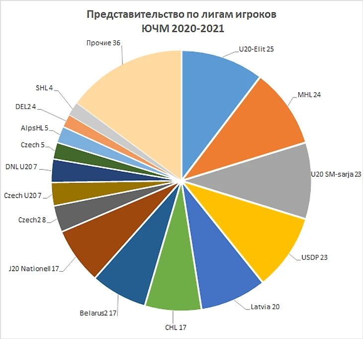 Наибольшее представительство на ЮЧМ обеспечила швейцарская лига U20-Elit - 25 игроков, вторая по представительности МХЛ - 24 игрока, по 23 хоккеиста представляли финскую U20 SM-sarja и американскую программу USDP.
