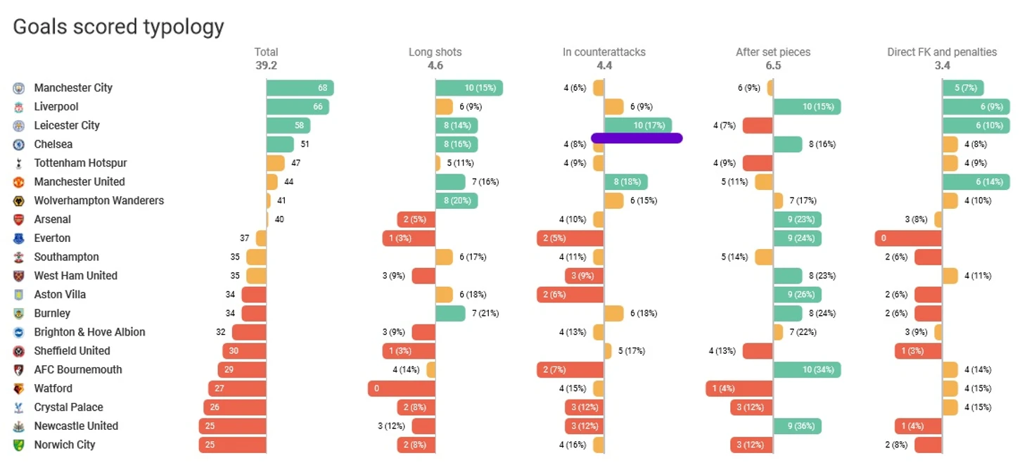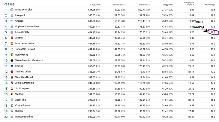 Главная задача «Лестера» при владении мячом – быстрый и эффективный переход в атакующую стадию. Это подтверждает наличие в составе быстрых и техничных игроков, с помощью которых «лисы» входят в ТОП-5 лиги по уровню игрового темпа (скорость игры в целом). Этот показатель является важнейшим аспектом во время контратаки, так как обеспечивает тот самый переход в последнюю треть за несколько секунд.
