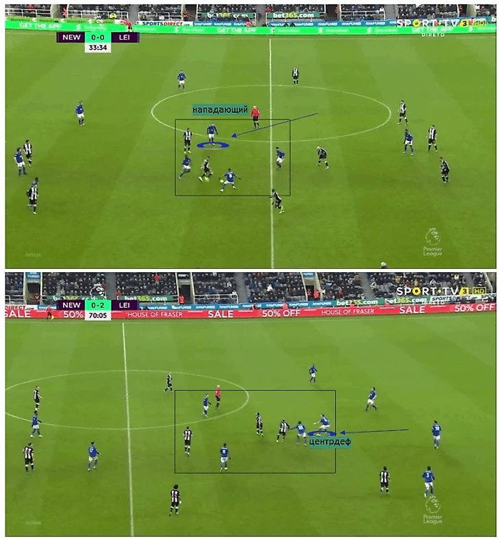 Если «Лестер» играет в расстановке с двумя нападающими, к примеру, по схеме 3-5-2, один из центрфорвардов опускается ниже и оказывает в этой области поддержку. С другого конца поля, если мяч ближе к финальной трети, центральный защитник поднимается выше линии обороны и пытается перегрузить одну из проблемных зон прессинга.
