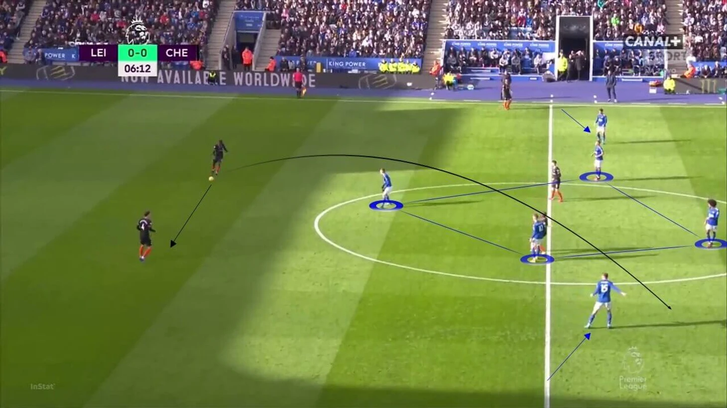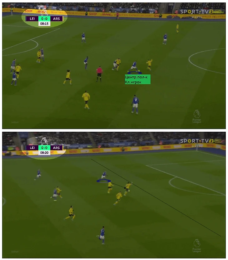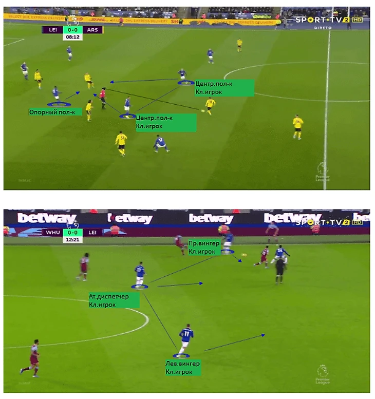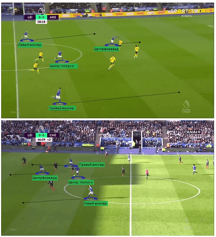 Важно отметить, что когда у «Лестера» во время игры наступает стадия перехода в атаку, то этот процесс обычно проходит по схеме 1+3: обладатель мяча плюс три атакующих партнера, которые пытаются оторваться от последних защитников за счет своей скорости.