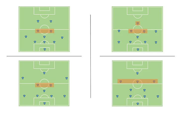 В схемах 3-5-2 и 4-3-3 ключевыми позициями являются два центральных полузащитника, которые находятся над опорным полузащитником. Это рассчитано на то, чтобы они первыми встречали мяч в средней трети поля. Кроме того, игроки центрального круга, поддерживая высокий прессинг, поднимаются ближе к чужой штрафной, сокращая дистанцию со своими атакующими партнерами, помогая при этом как при отборе, так и при дальнейшем развитии атаки.