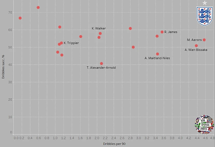 Из основных претендентов в сборную Киран Триппьер и Аарон Уан-Биссака имеют топовые 70% и 64% соответственно, а Кайл Уокер и Трент Александр-Арнольд находятся внизу списка с невпечатляющими 54,5% и 53,5%. У менее заметного Риса Джеймса из «Челси» тут все в порядке: он набирает 61% успешных действий, а также хорош в ряде других оборонительных метрик.