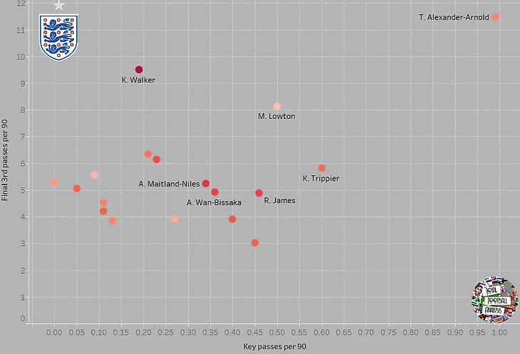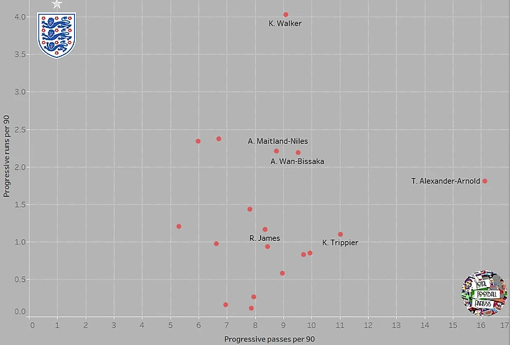 Кайл Уокер по-прежнему очень хороший защитник, но его цифры показывают, что у Саутгейта есть потенциально лучшие и более молодые варианты. Аарон Уан-Биссака достаточно надежен в обороне, но еще пока имеет средние показатели по продвижению, хотя прогресс его атакующих навыков дает надежду, что в скором времени команда получит игрока с идеальным сочетанием атакующего и защитного таланта.