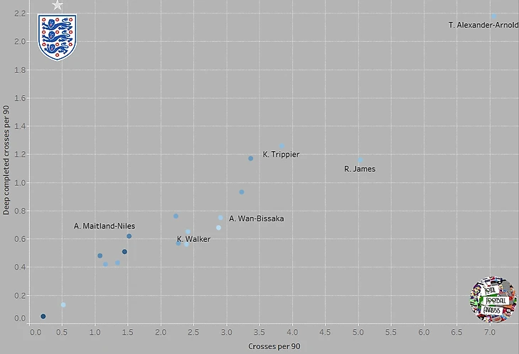 Триппьер и Джеймс тоже не плохи со своими показателями успеха в 30% и 29,2% соответственно. А Уокер и здесь худший с 26,9% на 2,4 кросса за матч. Этот график ясно показывает, что Александр-Арнольд на данный момент является лучшим кроссером среди этих игроков, потенциально одним из лучших в мире, а команда, имеющая такого игрока, может иметь множество вариантов доставки мяча в штрафные соперников.