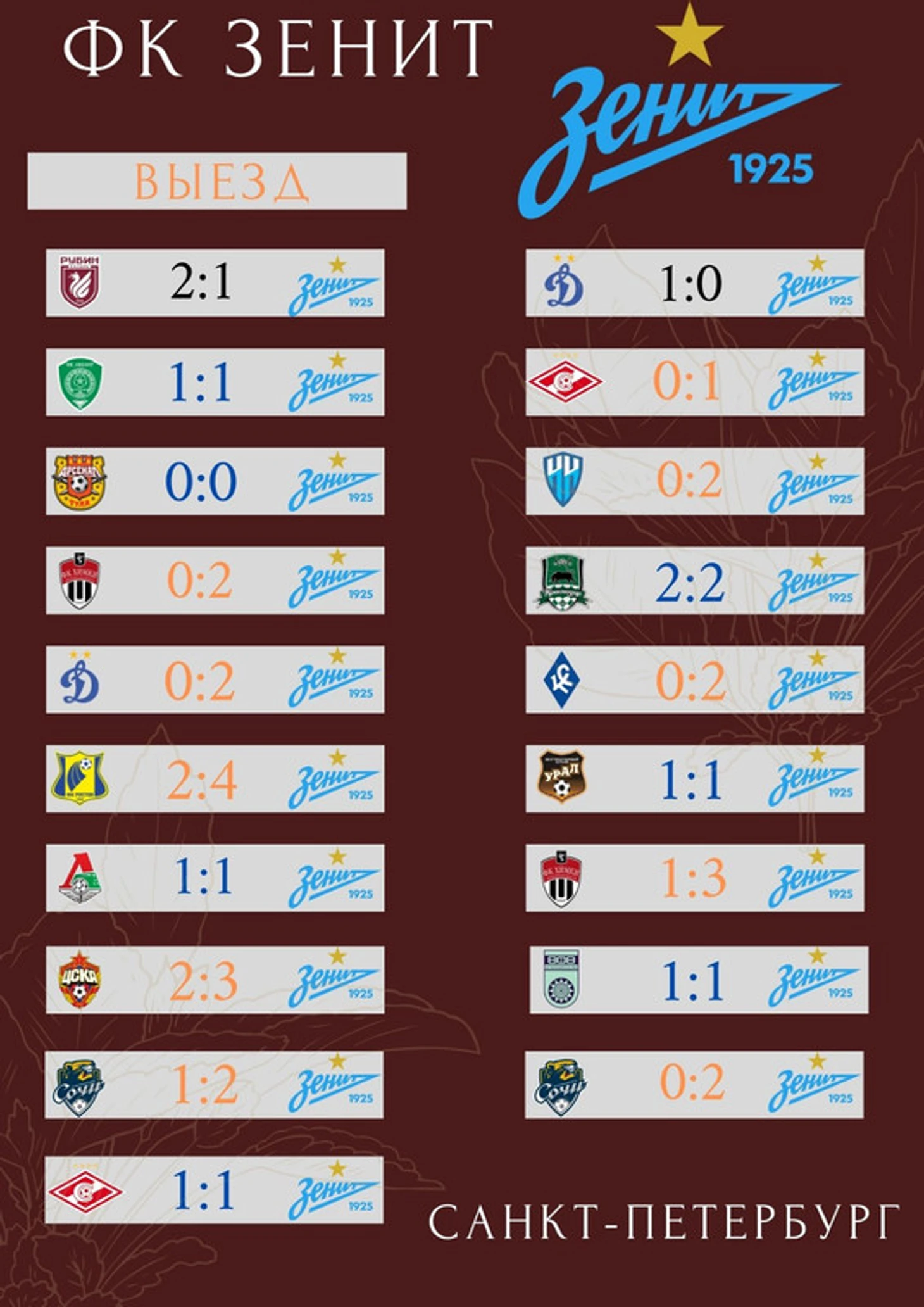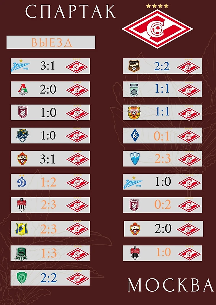 Например, Спартак в примере выше проводит с Зенитом матчи. Последние два матча в Москве Спартак - Зенит завершились с счётом 1:1 и 0:1. Последние два матча в Санкт-Петербурге Зенит - Спартак завершились с счётом 3:1 и 2:1.