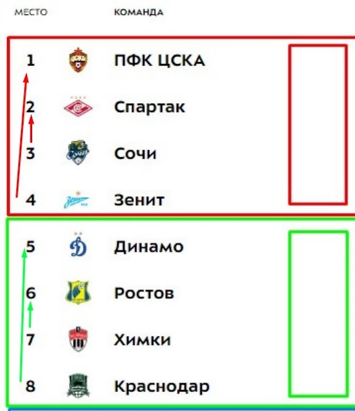 Аналогично в зеленой группе: команда 7 (она же 3 в случае команд 5, 6, 7, 8) Химки (см.картинку ниже) принимает команду 6 (2) Ростов, команда 8 (4) Краснодар принимает команду 5 (1) Динамо. Так и для всех остальных групп.