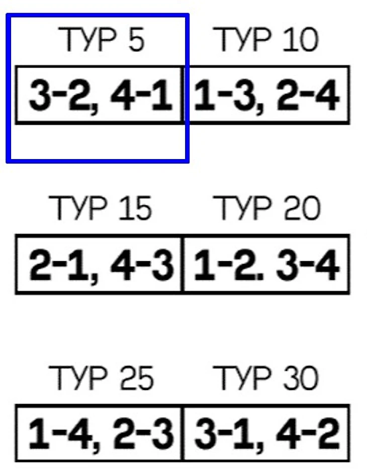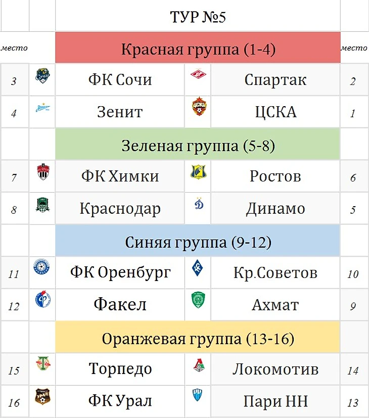 В туре №5, таким образом, по формату должны быть сыграны матчи между командами внутри красной (1-4 места), зелёной (5-8 места), синей (9-12 места) и оранжевой групп (13-16 места).