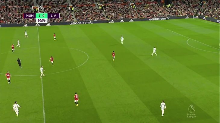 Как только мяч выигран в средней трети, Бруно и Эриксен действуют как распасовщики для Эланги, Рэшфорда и Санчо, которые атакуют пространство.