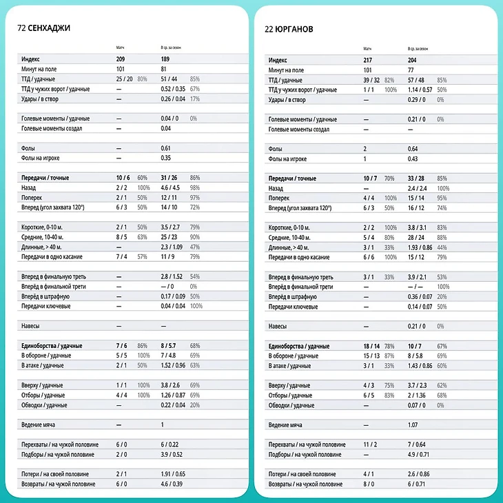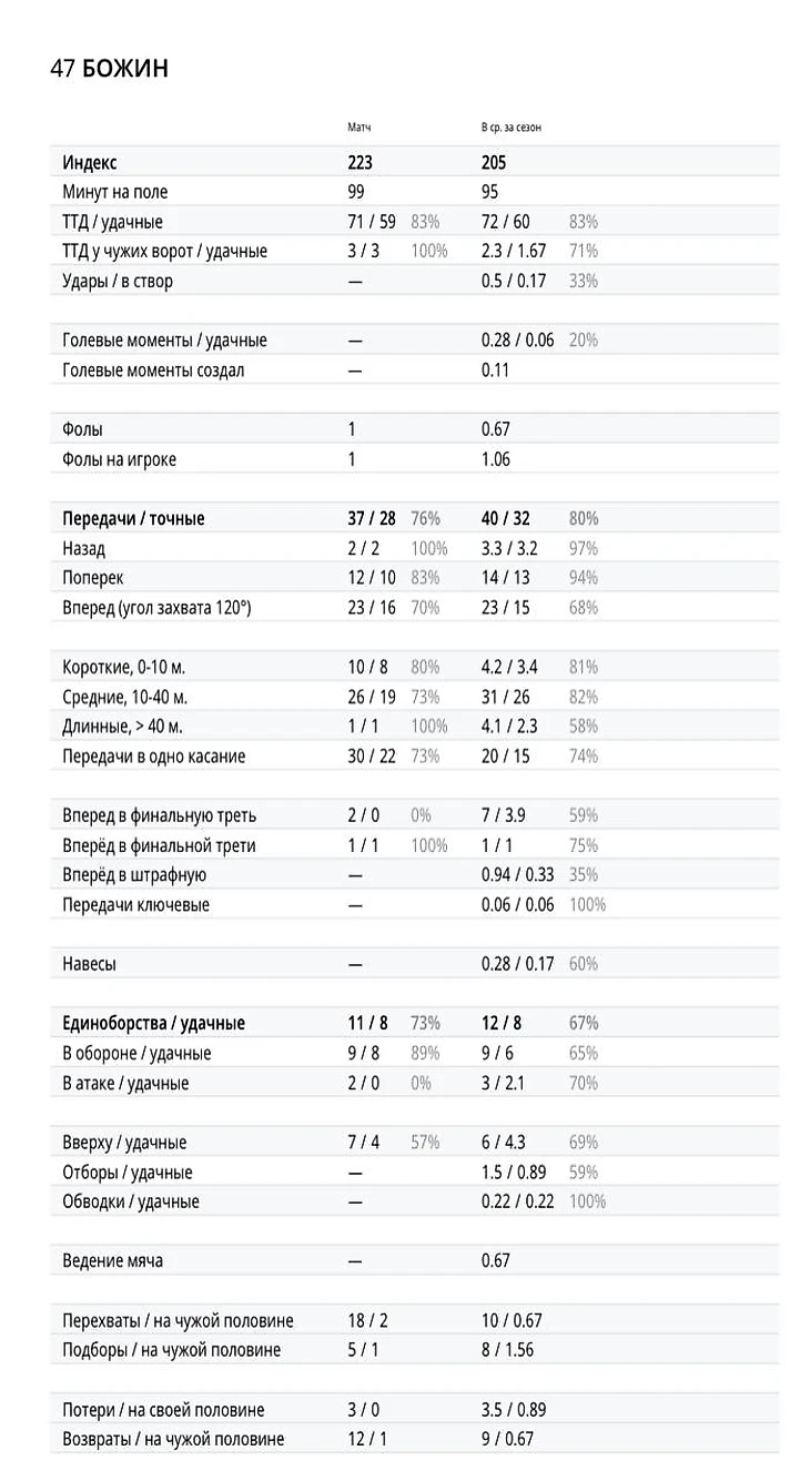 Что же мы видим, исходя из статистики? Сенхаджи и Юрганов провели великолепный матч, даже несмотря на 2 пропущенных мяча и сильного соперника. Кстати, предлагаем сравнить их показатели со средними показателями Божина по сезону: