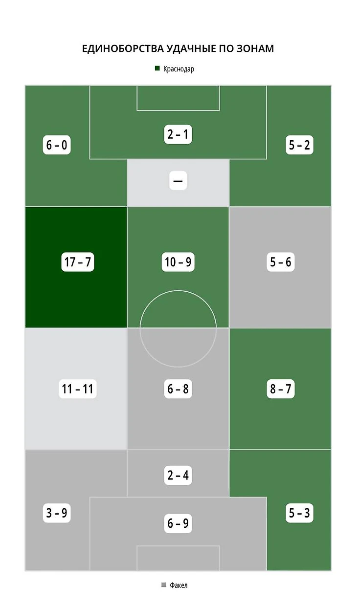 Как мы можем заметить, «Краснодар» чаще всего выигрывал единоборства именно на левом фланге атаки. К сожалению, можем констатировать факт, что Черов не справился с Виктором Са, который выдал просто выдающийся матч. Однако «не Васей едины», так как матч провалили все крайние защитники нашей команды. Эта проблема стала одной из главных для «Факела» в весенней части сезона.