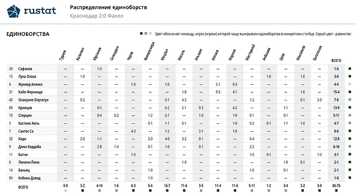 Наша команда всегда славилась тем, что мы перебарываем соперника. К сожалению, это нельзя сказать про последний матч. Во-первых, «Факел» уступил «Краснодару» в единоборствах со счётом 76-86. Во-вторых, Калинин и Черов на двоих проиграли борьбу в 9 случаях, что вследствие привело к множеству опасных моментов у наших ворот.
