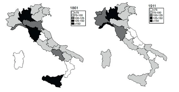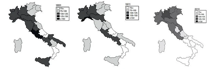 Объем трудовых доходов четырех северных регионов (Пьемонт, Валье-д’Аоста, Лигурия и Ломбардия) в 1960 году в два раза превышал объем семи центрально-южных регионов (Абруццо, Молизе, Кампания, Апулия, Базиликата, Калабрия, Сицилия и Сардиния).