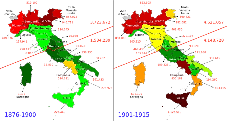 Две стадии эмиграции Италии (без Лацио и Сардинии как раз будет Королевство двух Сицилий). Во время первого исхода на юге лидирует Неаполь и Кампания. В начале 20-го века вперед уже вырвалась Сицилия.