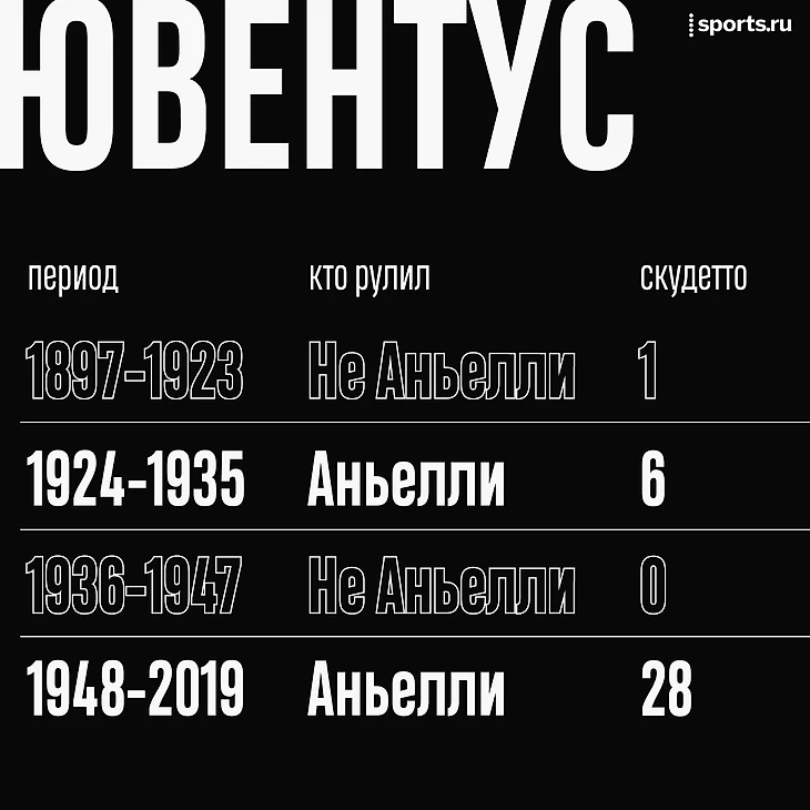 «Юве» и семейство Аньелли - самый продолжительный союз между индустрией и спортом. Если взаимоотношения «Милана» и Берлускони продолжались 29 лет, а история «Интера» и семейства Моратти в общей сложности 34 сезона (15 Анджело и 19 Массимо), то вот «Ювентус» и Аньелли вместе уже почти 90! Нет в мире ни одного подобного клуба, вся история которого была бы завязана на его собственнике.