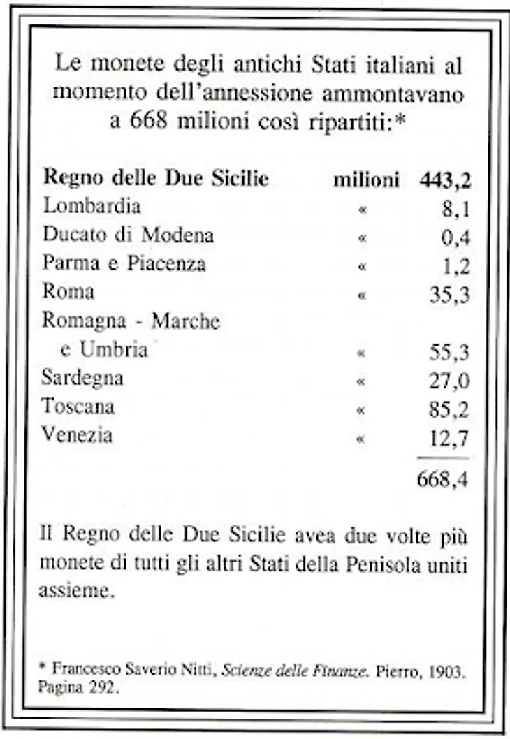 Главное – в королевстве Обеих Сицилий по состоянию на 1859 год были самые низкие налоги во всей Италии, а по официальному курсу за 1 неаполитанский дукат давали 4,25 пьемонтских лиры. В Южном королевстве запасы золота были в два раза больше, чем во всей Италии вместе взятой!