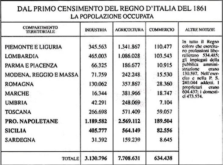 Перепись 1861 года. Занятость населения в том или ином секторе. Промышленность, сельское хозяйство и коммерция. Просто сравните Неаполь с треугольником Лигурия-Пьемонт-Ломбардия.