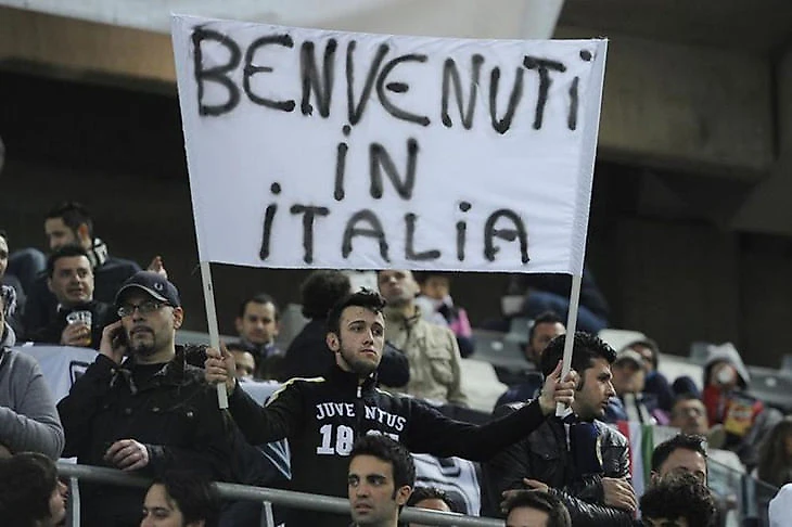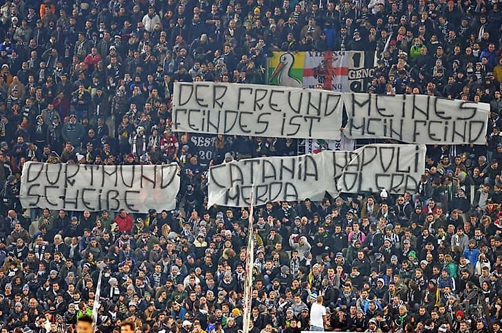 Болельщики «Ювентуса» встречают фанатов Дортмунда, которые дружат с «Наполи» и «Катанией». «Дерьмо» на немецком, «дерьмо» на итальянском и «Наполи» с «холерой».