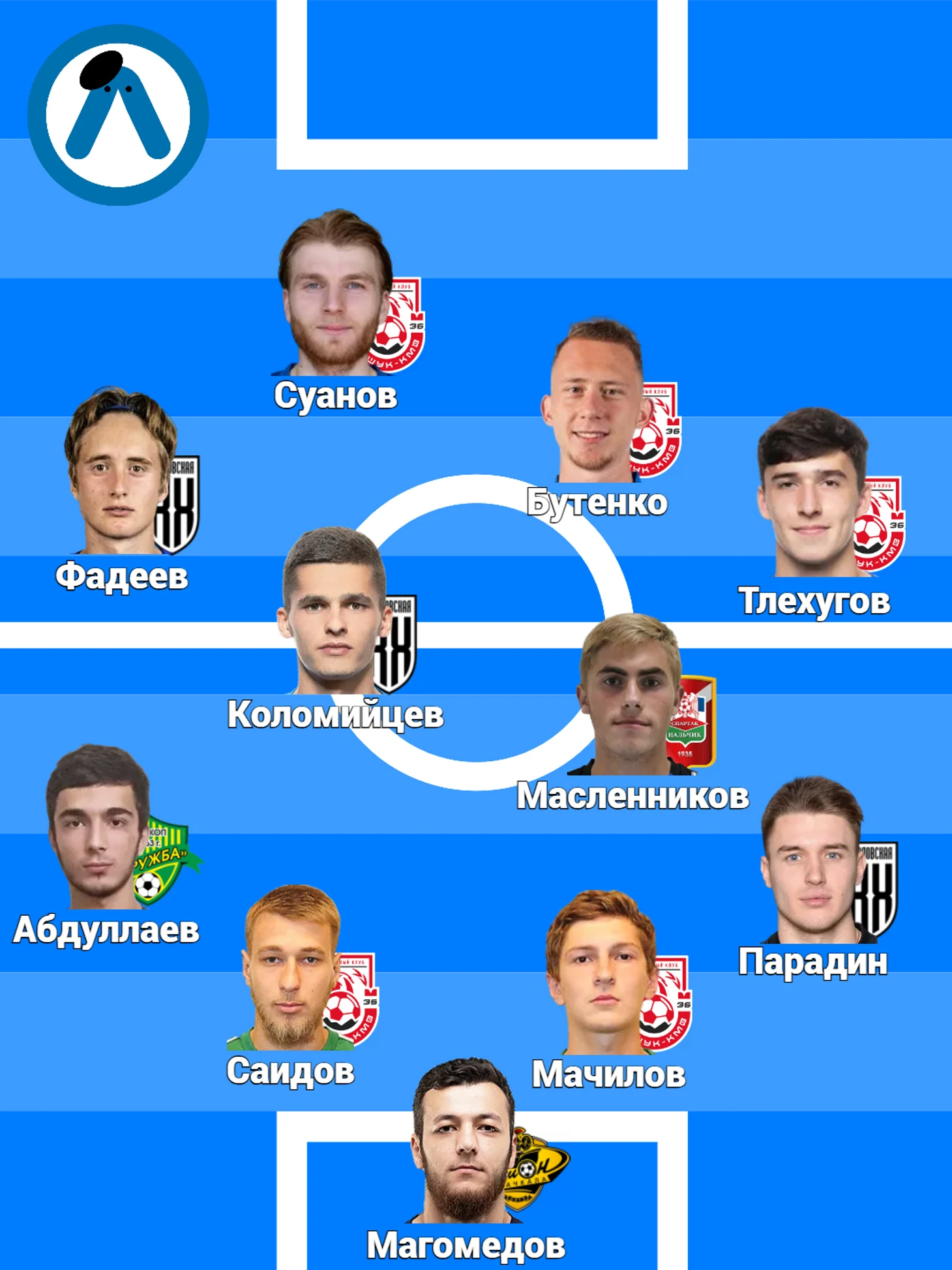 Фланги защиты заняли Исламитдин Абдуллаев (2000 г.р) и Игорь Парадин (1998 г.р). Тут стоит отметить и Магомеднаби Ягьяева (1999 г.р), который провел очень качественный сезон и однозначно потянет «золото», его непопадание в мою сборную – чисто тактический момент. Аджинджал, стоящий у руля «Дружбы» в этом сезоне, выстроил структуру игры в три центрбека, а в роли латералей – Ягьяев и постоянно сваливающийся в зону крайнего вингера Абдуллаев. Поставив в одну сборную Исламитдина, имеющего высокий процент успешных обводок, хорошую взрывную скорость и агрессию в отборах и на подборах, а также Магомеднаби, действующего не менее высоко, оголились бы фланги сборной. Поэтому справа действует Парадин, который после травмы сбавил в скоростных данных, а при переходе на схему 3-х-х может сыграть правого центрального защитника. По ходу сезона Игорь никак не выделялся – располагался узко, высоко не подключался, но зато все действия были уверенными и хладнокровными. Позицию опорника занял Игорь Масленников (2001 г.р), а над ним расположился Михаил Коломийцев (2000 г.р). Игорь обладает прекрасной антропометрией (187 см / 79 кг), хорошо действует в отборе, неплохо разгоняет атаки своей команды, дает высокую интенсивность и агрессивность в своей зоне, но теряется под качественным прессингом – наверное, поэтому он и не подошел в «КАМАЗ», куда ездил в начале сезона на просмотр. Несмотря на данный недостаток, Масленников является главной деталью механизма нальчикского «Спартака» Биджиева, а также одним из сильнейших хавбеков во Второй лиге Б. Коломийцев же в этом сезоне показал себя не в полной мере, да и вообще был игроком ротации в «Кубань-Холдинг» – выиграть конкуренцию у вечно молодого Дышекова или Дохова, которого Саркисов брал под себя, было практически невозможно. Но в целом, несмотря на малый процент игрового времени, Михаил показывал качественную игру: высокая скорость мышления, немалое количество ключевых передач, хорошая циркуляция мяча и готовность брать на себя в любых ситуациях.
