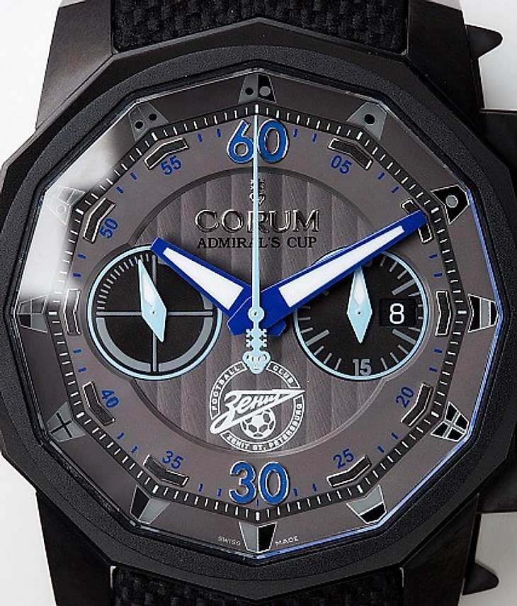 Сотрудничество швейцарского бренда Corum и ФК «Зенит» вылилось в создание интересной и стильной модели CORUM Admiral's Cup FC Zenit. Часы исполнены в черно-сером цвете, циферблат украшен логотипом ФК «Зенит», а стрелки и цифры имеют сине-бело-голубые цвета. Корпус сделан из титана, а три строчки на черном кожаном ремешке исполненные в синем, белом и голубом цвете лишний раз подчеркивают клубную принадлежность модели.