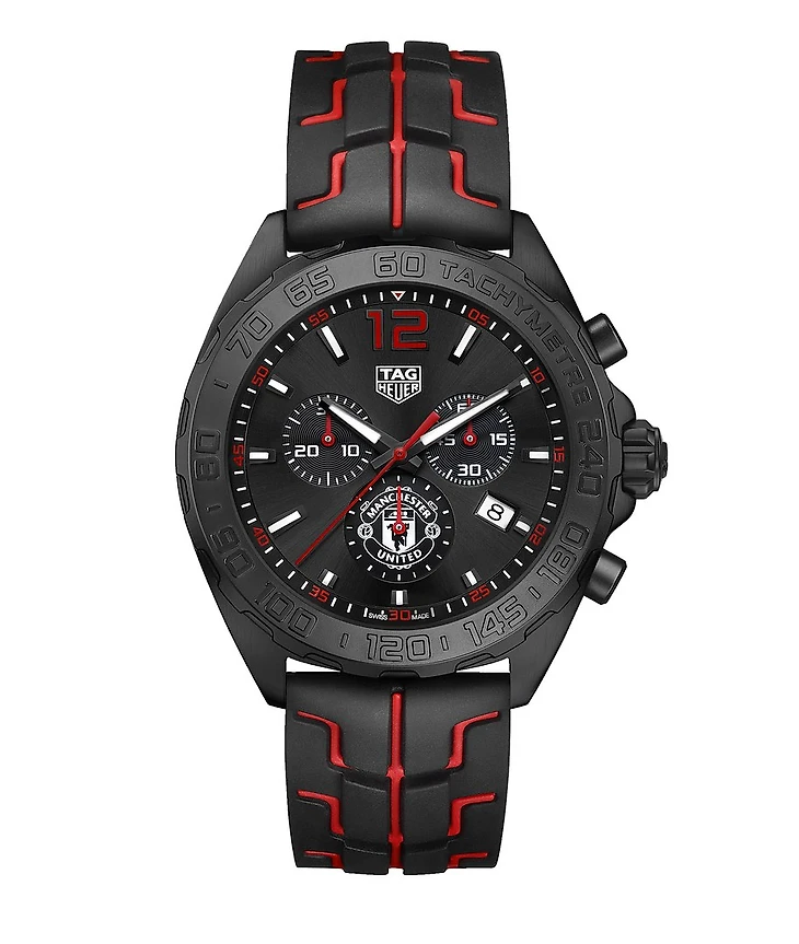 Первая модель сделана в спортивном стиле, часы исполнены в черной цветовой гамме с красными вкраплениями в виде цифр, стрелки счетчиков хронографов и секундной стрелки. Спортивный стиль в этой модели определяет черно-красный каучуковый ремешок. Болельщику «Манчестер Юнайтед» такие часы обойдутся в 96 000 рублей.