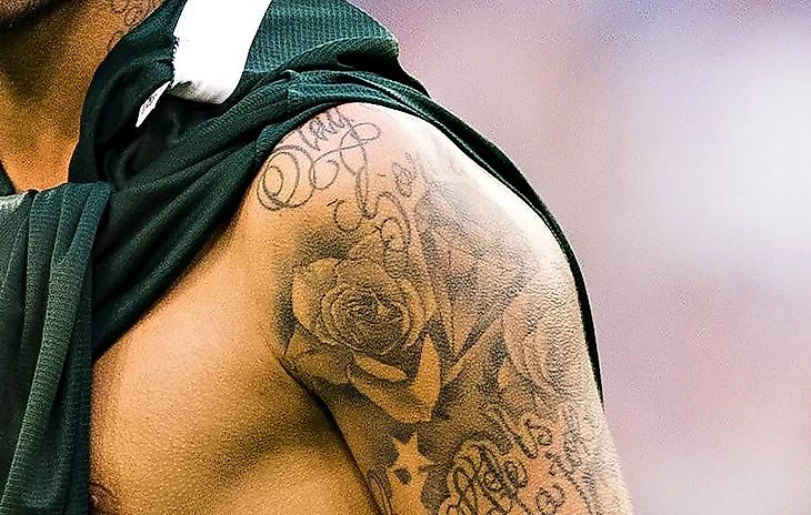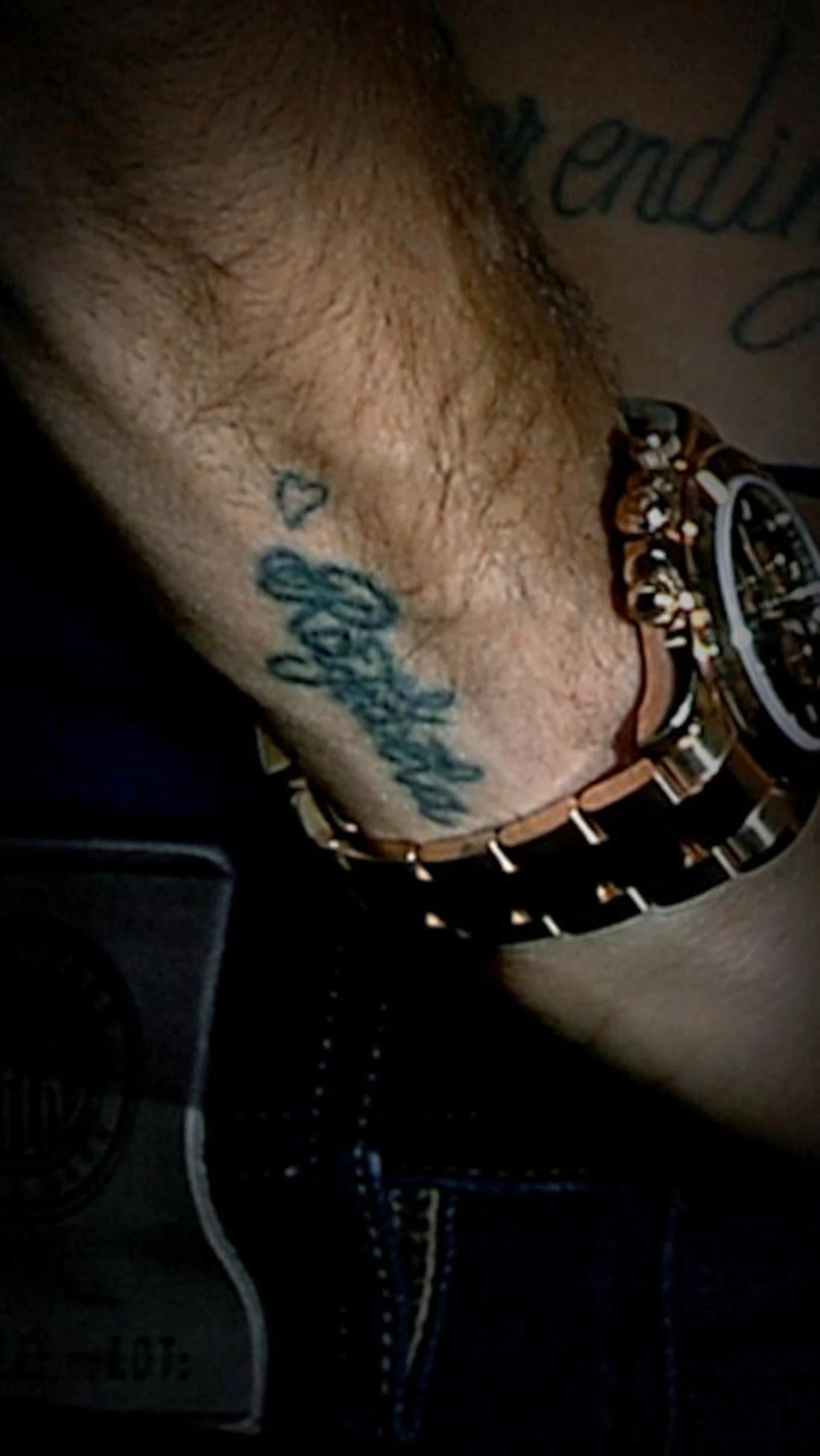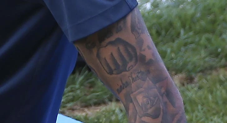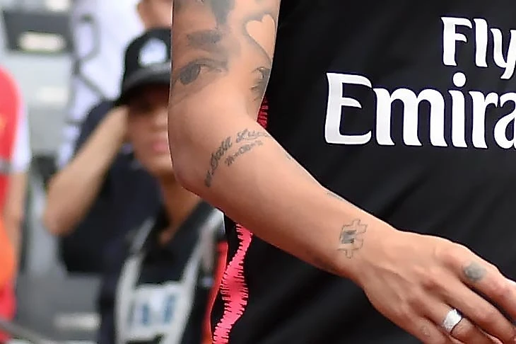 На левом плече у нападающего «ПСЖ» сразу несколько тату. Надпись «Оставаться сильным», бриллиант и надпись «Сорелла», что в переводе с итальянского означает «сестра». У Рафаэллы есть тату в таком же стиле, только со словом «брат» по-итальянски.