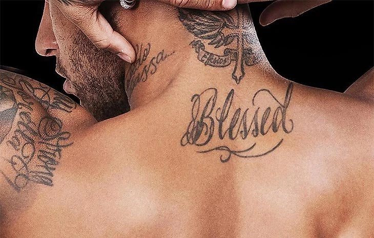 Еще одно тату, подтверждающее религиозность бразильца. На шее Нея набит крест и надпись «Благословенный». «Я был воспитан в религиозной семье и верю в Бога», – сказал Неймар.