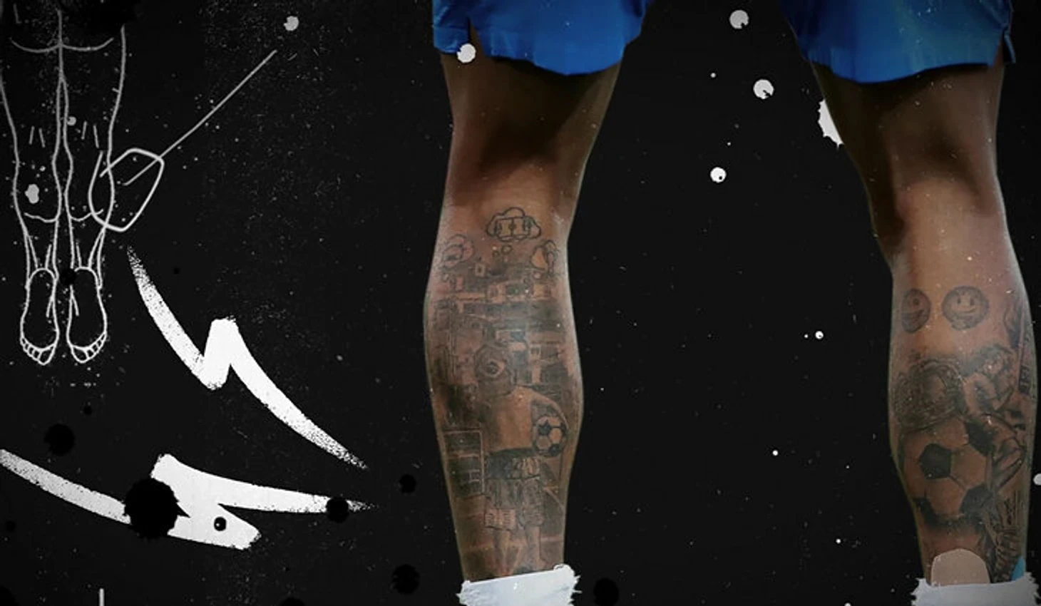На икроножной мышце левой ноги Неймара изображен бразильский мальчик в кепке с флагом страны и футбольным мячом. Он стоит на футбольном поле в бразильских фавелах. Эта татуировка символизирует то, что Неймар пережил в детстве, о чем мечтал и как далеко хотел пойти, рассказывает Роза.