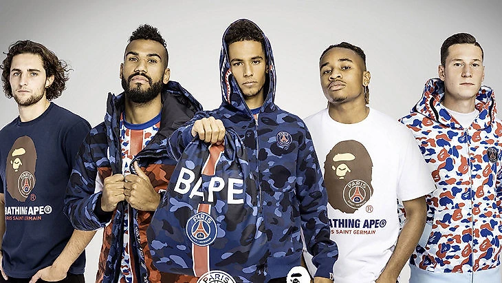 В рамках коллаба с BAPE 13 классических моделей японского бренда были переработаны в синих, красных и белых цветах «ПСЖ». Теплая куртка с фирменной лентой парижан стала главным элементом коллекции, помимо этого представлены толстовки, футболки, шорты и маски для лица. Толстовка с капюшоном на официальном сайте BAPE стоит $469 (31 тысяча рублей).