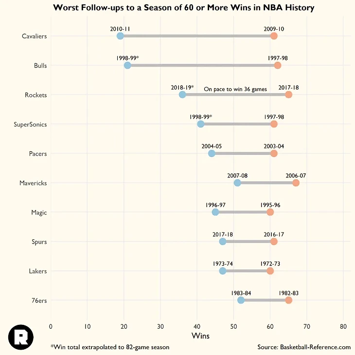 Из 10 крупнейших спадов, которые мы видели в истории НБА и которые соответствуют этим критериям, большинство команд в списке стали хуже, потому что они потеряли звезду: Шакил О'Нил покинул Меджик как свободный агент; Уилт Чемберлен покинул Лейкерс; Пэйсерс потеряли Джермейна О'Нила, Рона Артеста и Стивена Джексона из-за побоища на домашней арене; драма Кавая Ленарда в прошлом сезоне оставила Шпоры без его, действительно, меняющего игру присутствия. Хьюстон питается той же звездной силой, что и в прошлом сезоне, но команда рушится. Защита Ракет упала с седьмой лучшей до шестой худшей, а их нападение упало с первого до седьмого.