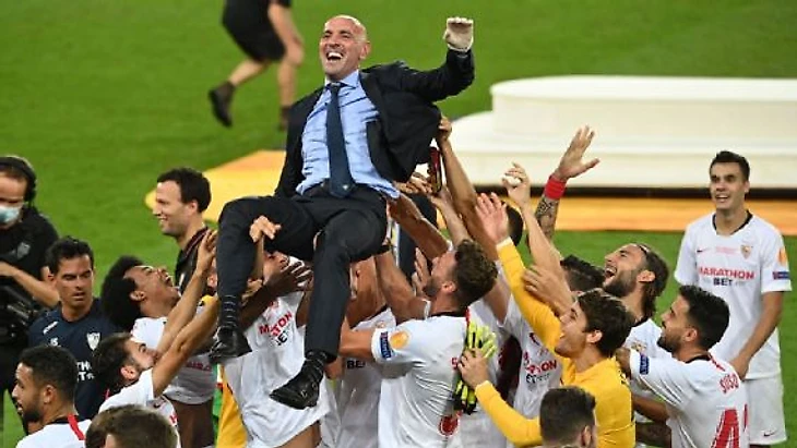 Мончи, которого подбрасывают в воздух игроки «Севильи» после их последнего титула в Лиге Европы, заслужил одобрение во всем футбольном мире за создание своей команды.