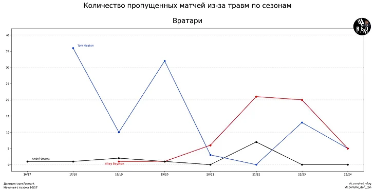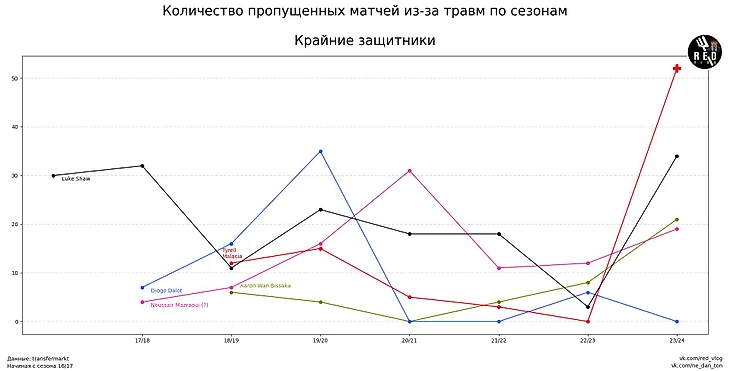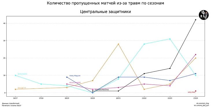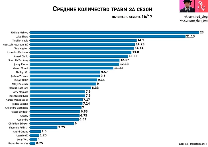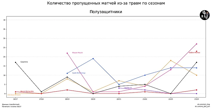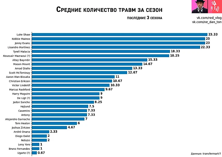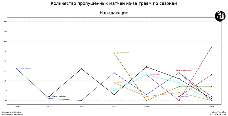 Графики травм игроков Манчестер Юнайтед по сезонам