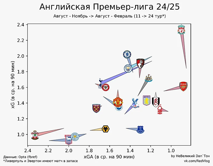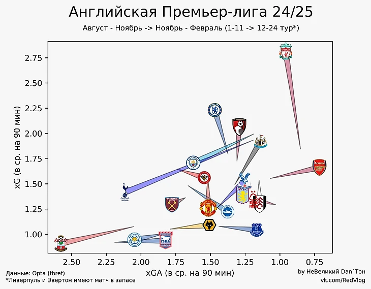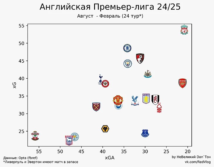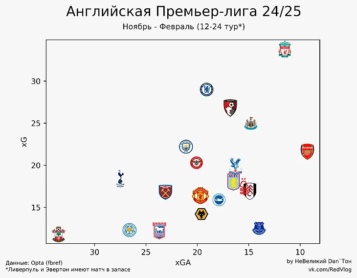 Статистика АПЛ. xG и xGA 12-24 тур и сезон в целом.