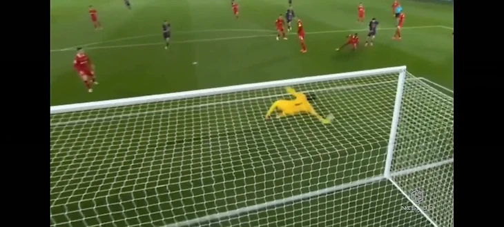 А в этой ситуции, наоборот, выбить мяч своему уже не получалось, так что максимально неудобный мяч с отскоком от газона пришлось забирать. К сожалению не нашел крупного плана, но на нем было видно, что мяч пришлось ловить запястьями, но Алиссону в тот вечер было подвластно даже такое.