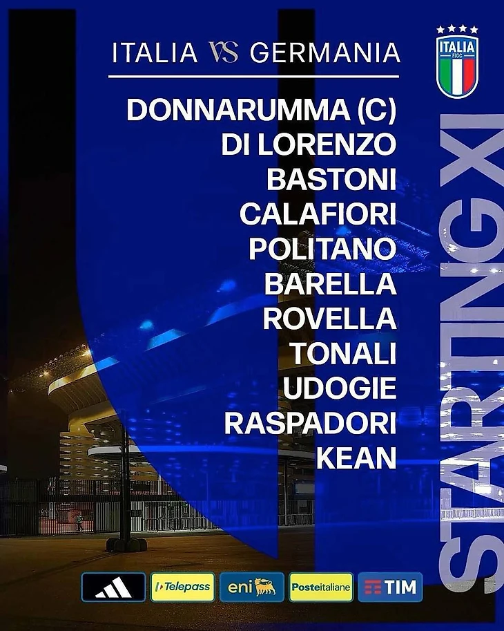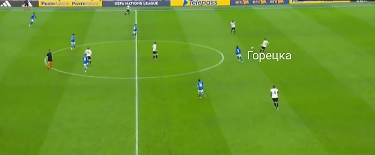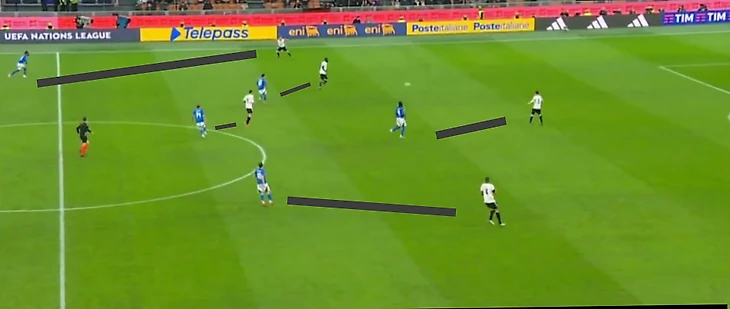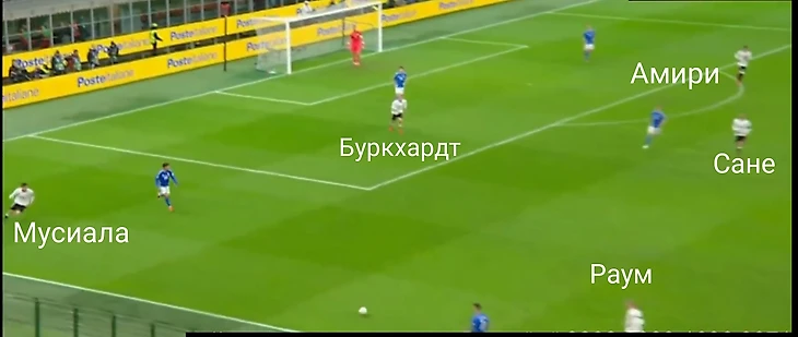 В целом не сказать, чтобы мы получили много неожиданностей на старте матча. Спалетти ставит типичный современный итальянский футбол, где каждый игрок действует по всей длине поля и большинство из них взаимозаменяемы. Такая схема требует некоторой системности, но так как семеро из десяти игроков основы играют в Серии А и знают эту систему по своим клубам (Бастони, Барелла и Калафьори–продукты законодателей данной моды–Мотты и Индзаги; Политано, Распадори и Ди Лоренцо–из «Наполи» Конте, игра которого хоть и более консервативна, также подразумевает вертикальный футбол и фланговых игроков в гибридной роли). Немцы же по устоявшимся традициям делают ставку на контроль мяча.