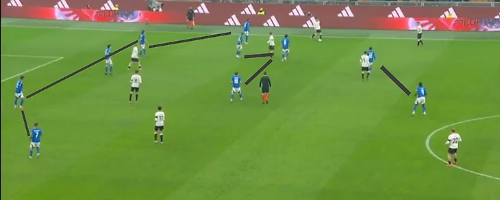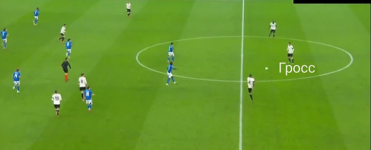 Подробнее это выглядело так: сначала Германия выходила из обороны через короткий пас. Так как итальянцам был не нужен лишний риск, первая треть поля проходилась без сопротивления. Дальше немцы выстраивались в самую популярную нынче схему для владения с высоким расположением крайних защитников и одним из опорников в первой линии.